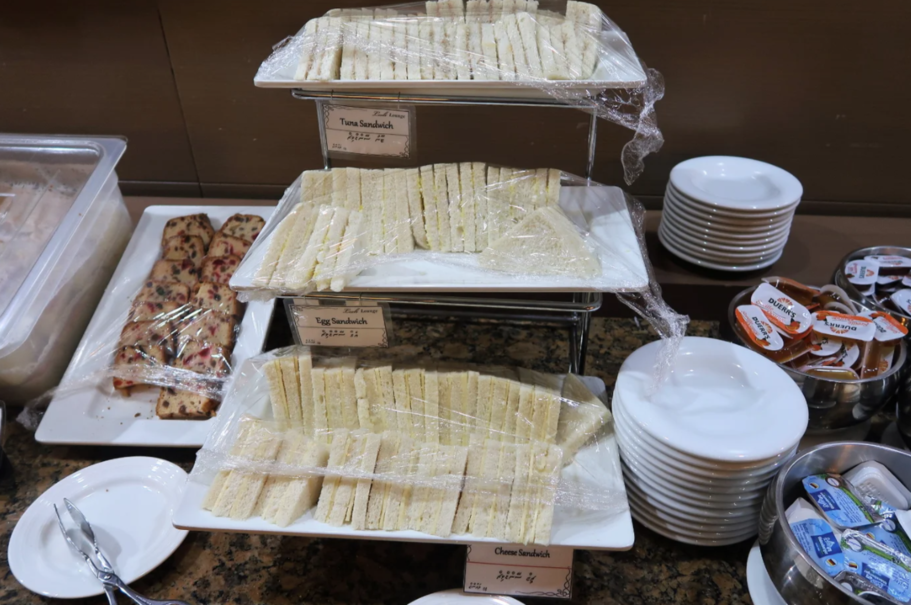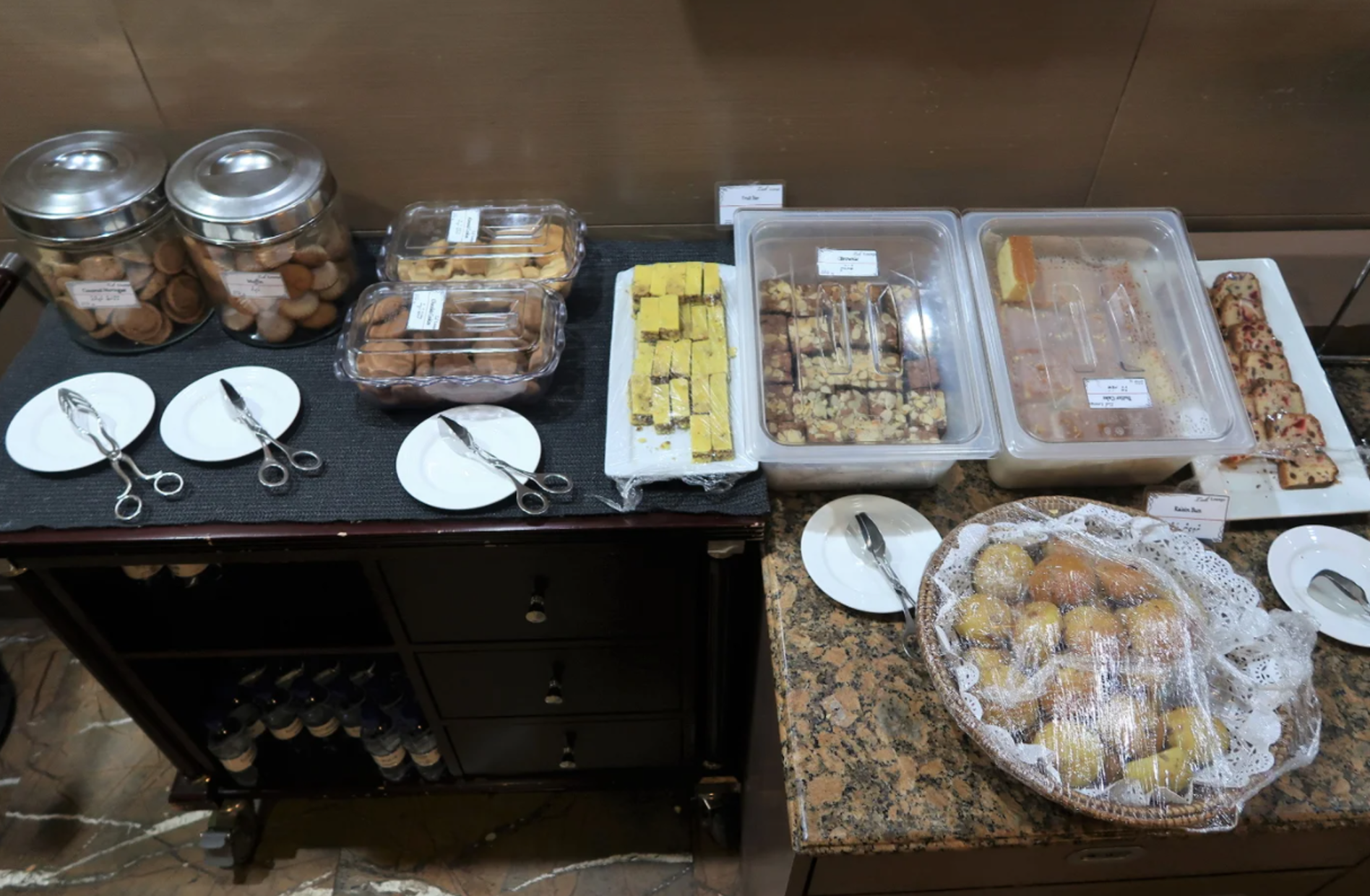 샌드위치와 각종 쿠키, 빵류, 따뜻한 스프, 기타 약간의 음식,