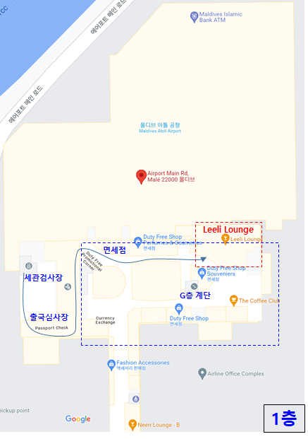 말레공항의 Leeli 라운지는 국제선 출국 면세점 끝부분에 위치해있다.